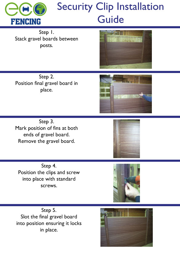 The installation of a ECO-FENCING system is easy and straightforward. All our products are compatible with recognised building and fencing material. ECO-FENCING can be sawn and fixed using traditional methods. The following easy-to-understand picture guide provides a detailed summary of installation. We recommend when erecting a fence over 6' tall that a cement grout is poured down the inside of the post up to waist height, this will ensure the product gives the best performance on high fences. A complete guide can be downloaded to print in PDF format by clicking on the button at the bottom of the page.