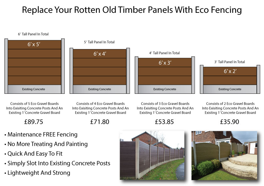 Build your own maintenance free panel with eco fencing. Eco gravel boards are simply stacked to the required height to create a strong and durable panel that never needs treating. The boards are lightweight and strong and can easily be slotted into existing concrete posts to replace your old rotten timber panels.